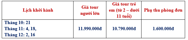 Ngày khởi hành: Tháng 11: 4, 18; Tháng 12: 2, 16