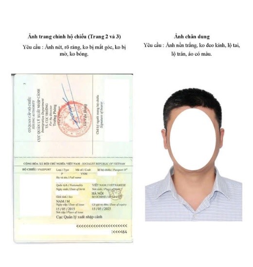 Ảnh trang chính hộ chiếu (Trang 2+3) theo mẫu (như hình bên) gửi hồ sơ trước ít nhất 9 ngày làm việc (không tính t7, CN)