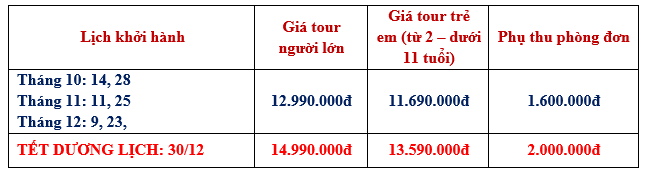 Ngày khởi hành: Tháng 11: 11, 25; Tháng 12: 9, 23