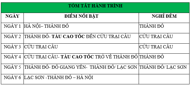 NGÀY 2: THÀNH ĐÔ - TÀU CAO TỐC- CỬU TRẠI CÂU (ĂN SÁNG/ TRƯA/ TỐI)