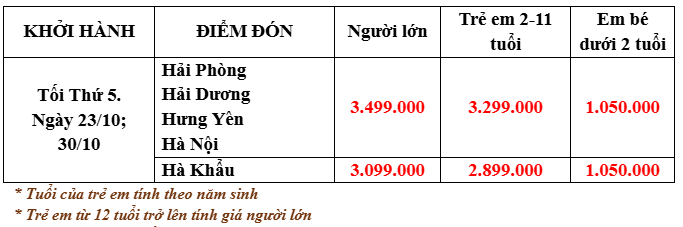 Khởi hành: Tối Thứ 5 về Chủ nhật hàng tuần.